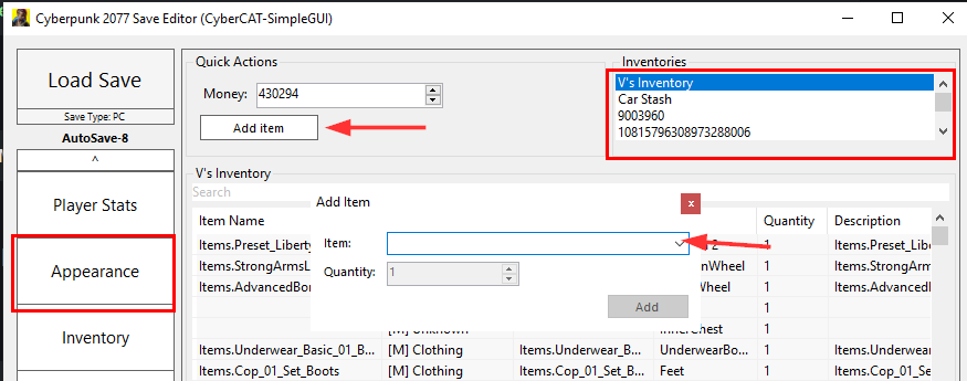 In the Add Item tab, you can use the dropdown to search the item's base ID. If that doesn't help you, check the top sections of our wiki page [spawn-codes-baseids-hashes](https://wiki.redmodding.org/cyberpunk-2077-modding/for-mod-creators-theory/references-lists-and-overviews/equipment/spawn-codes-baseids-hashes "mention") on how to find a specific item.