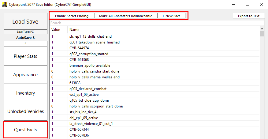 While the save editor currently supports setting them, we recommend using CET commands if you must go down that route. The [CET command list](https://1drv.ms/x/s!ArM35g0UkWjvjcVPT-fhFPPCZUfDLw?e=BOxScl) contains *some* that *might* work in very few instances. Again, most of these are not supported and are highly dependent upon when they are set.
