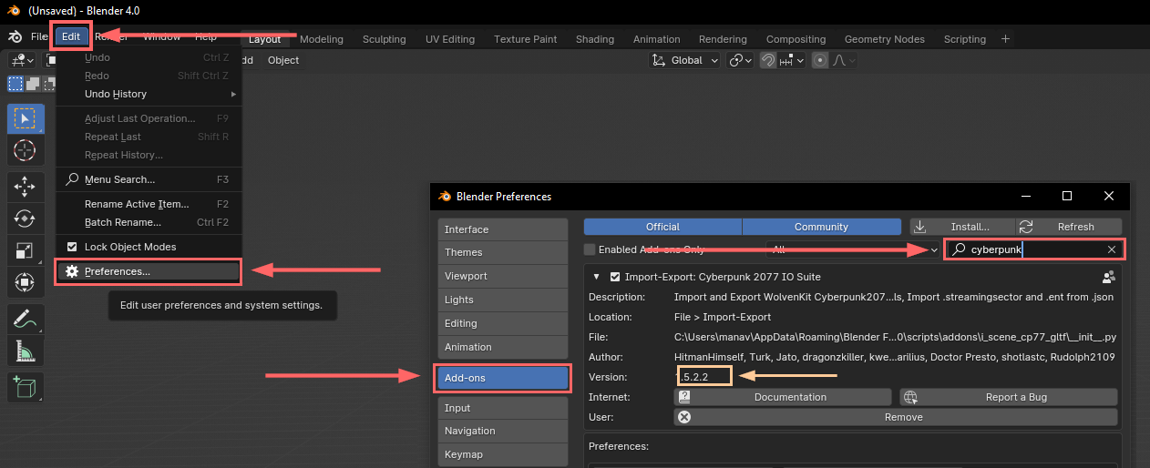 This page contains troubleshooting options for the [](https://wiki.redmodding.org/cyberpunk-2077-modding/for-mod-creators-theory/modding-tools/wolvenkit-blender-io-suite "mention").