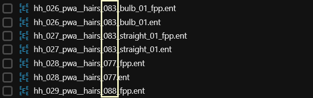 e.g., if you wanted to edit the entity file for female V's hair 28 `hh_083_wa__ponytail_01`, you could search for