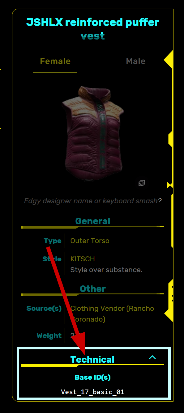 * `Vest_17` is the name of the item. You can use this to find its control files (see Step 2 below).