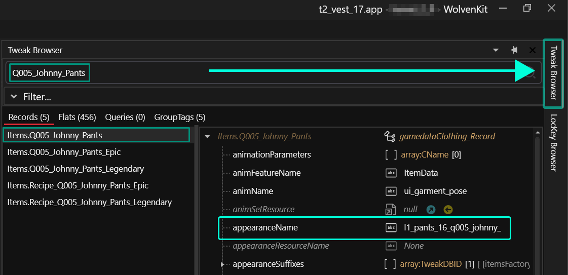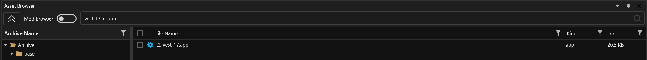 1. Open WolvenKit and use the Asset Browser to search for the item's app file:\
