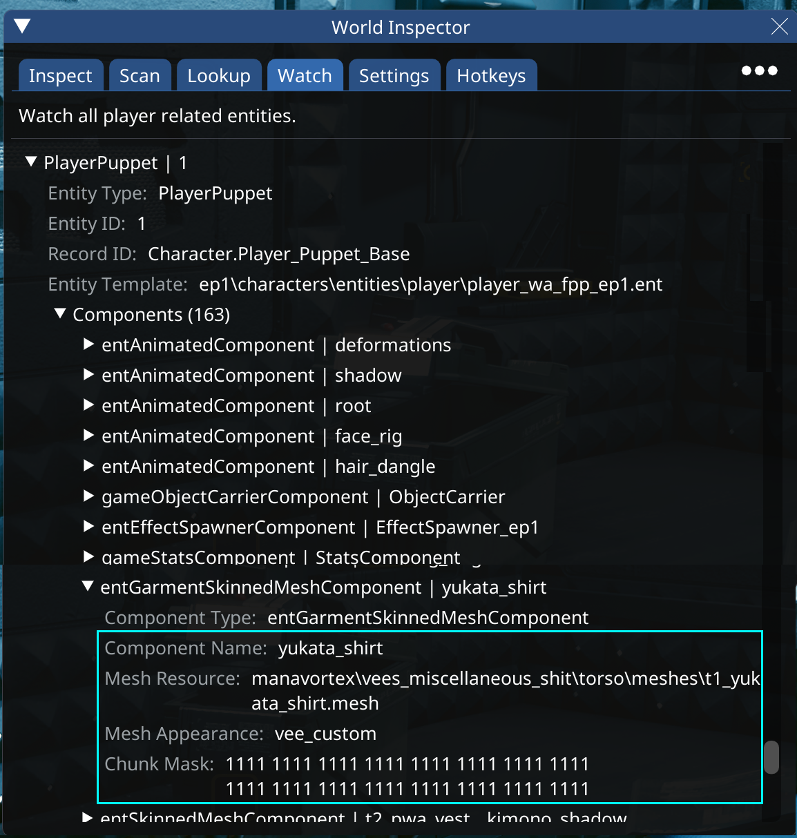 The developer utility [redhottools](https://wiki.redmodding.org/cyberpunk-2077-modding/for-mod-creators-theory/modding-tools/redhottools "mention") offers you the option to watch the player: [#world-inspector-watch-the-player](https://wiki.redmodding.org/cyberpunk-2077-modding/modding-tools/redhottools/rht-the-world-inspector#world-inspector-watch-the-player "mention"):