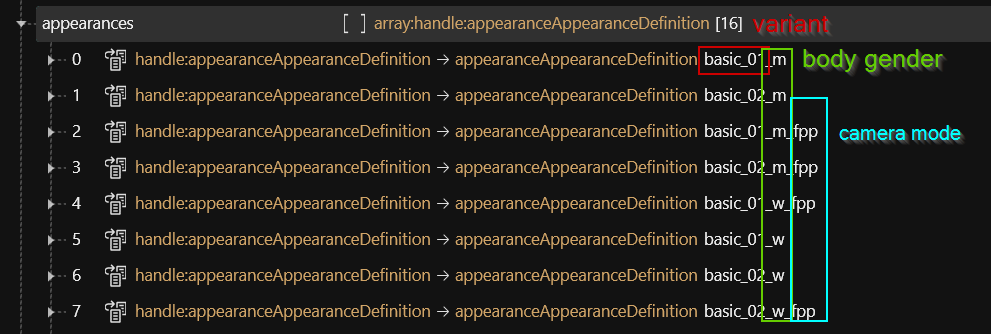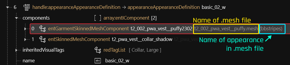 \&#xNAN;*To learn more about this, check* [https://github.com/CDPR-Modding-Documentation/Cyberpunk-Modding-Docs/blob/main/for-mod-creators-theory/files-and-what-they-do/file-formats/appearance-.app-files](https://github.com/CDPR-Modding-Documentation/Cyberpunk-Modding-Docs/blob/main/for-mod-creators-theory/files-and-what-they-do/file-formats/appearance-.app-files "mention")*. This is not necessary for this guide.*
