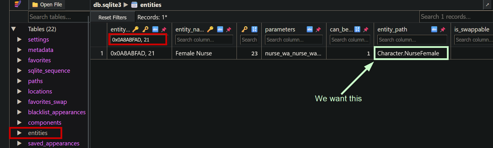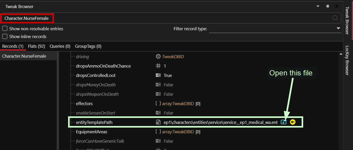 3. In the search field at the top, search for your TweakDB ID (e.g. `Character.NurseFemale`)