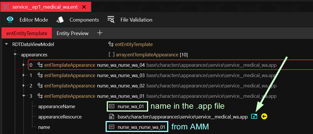 1. In the `appearances` list at the top of the file, find the entry with the name from the .ent file