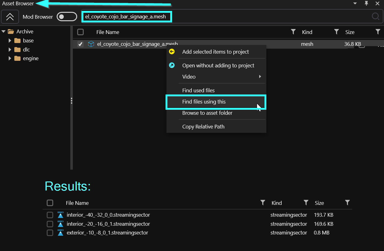 For technical stuff about sectors and the really manual way to look for things go [here](https://wiki.redmodding.org/cyberpunk-2077-modding/for-mod-creators/files-and-what-they-do/the-whole-world-.streamingsector). For less masochistic methods read on.