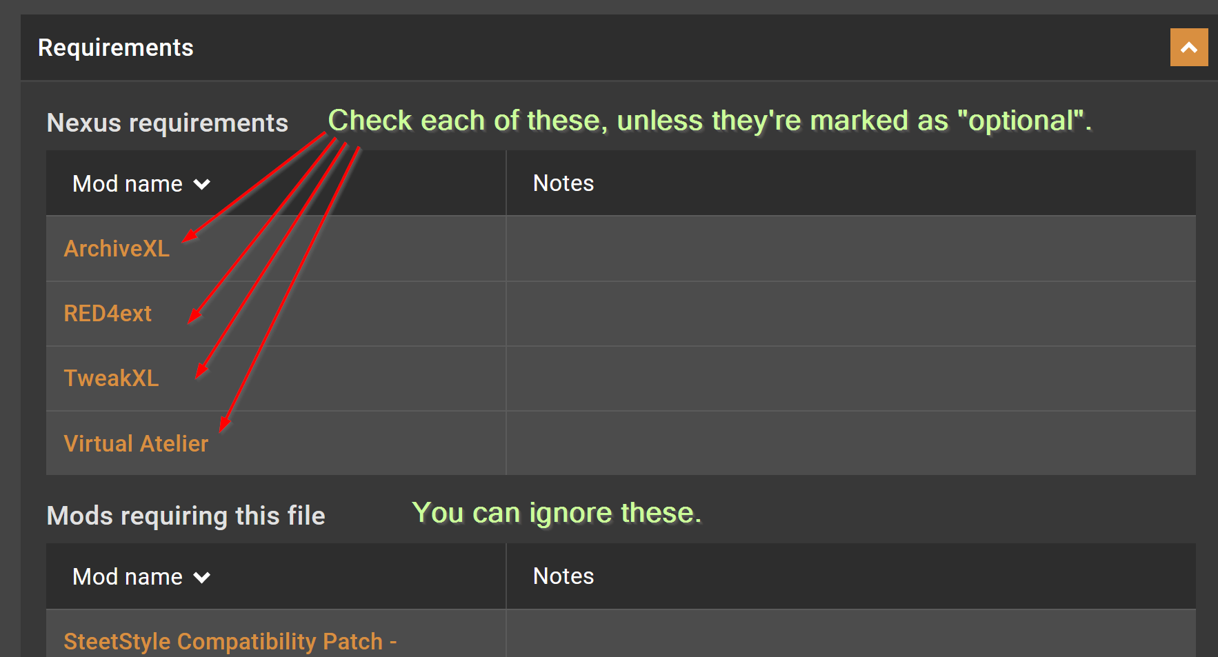 <figure><img src="https://1427525421-files.gitbook.io/~/files/v0/b/gitbook-x-prod.appspot.com/o/spaces%2F4gzcGtLrr90pVjAWVdTc%2Fuploads%2Fgit-blob-94b75e854a97743116cb4ca31359355e03473e1f%2Fdependencies_find_on_nexus.png?alt=media" alt=""><figcaption><p>If you don't know if a mod is optional, it's most likely not.</p></figcaption></figure>