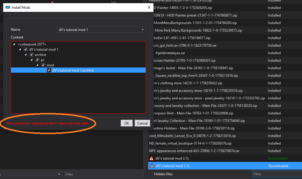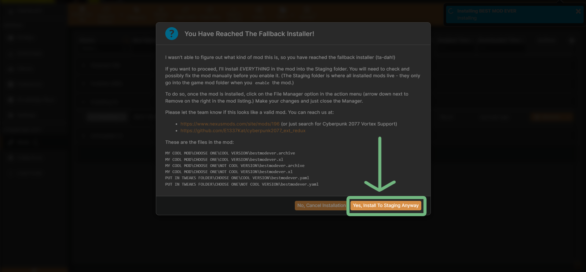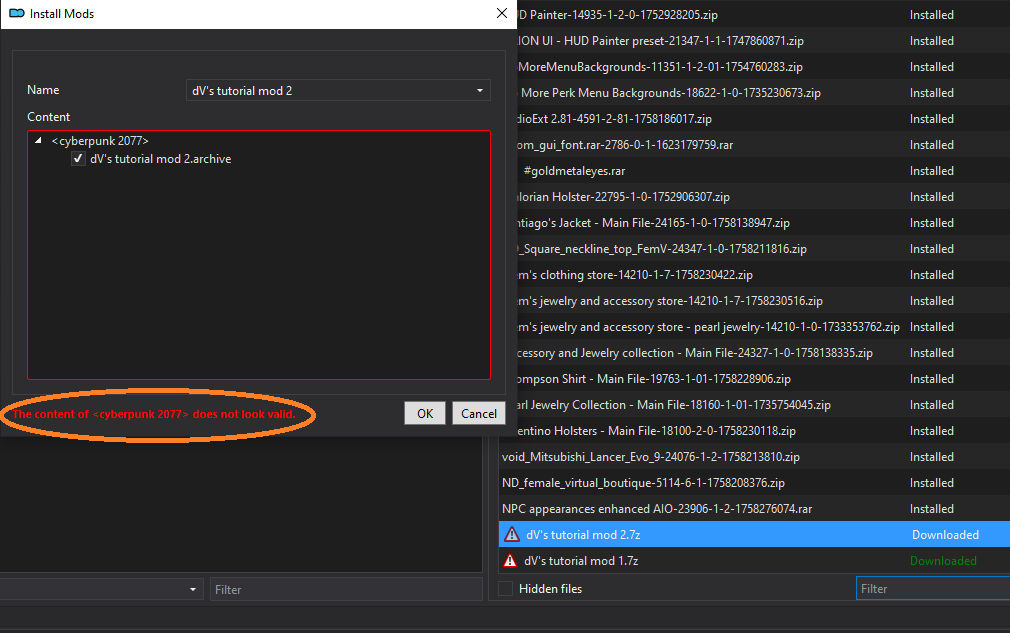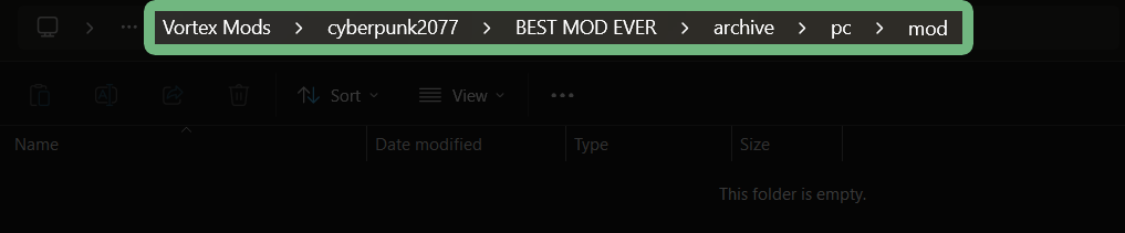 If you have problems with Vortex, check the [corresponding section](https://wiki.redmodding.org/cyberpunk-2077-modding/for-mod-users/users-modding-cyberpunk-2077/getting-started/vortex-mod-manager) of the guide.
