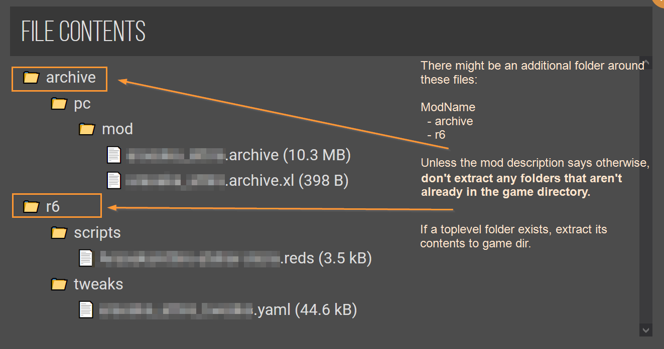 <table><thead><tr><th width="200">File type</th><th>Folder path</th></tr></thead><tbody><tr><td><code>.archive</code></td><td><code>/archive/pc/mod/</code></td></tr><tr><td><code>.xl</code><br><code>.archive.xl</code></td><td><code>/archive/pc/mod/</code></td></tr><tr><td><code>.reds</code></td><td><code>/r6/scripts/</code></td></tr><tr><td><code>.tweak</code><br><code>.yaml</code></td><td><code>/r6/tweaks/</code></td></tr><tr><td><code>.lua</code></td><td>a subfolder of <code>/bin/x64/plugins/cyber_engine_tweaks/</code></td></tr><tr><td><code>.ini</code></td><td><code>engine/config/platform/pc</code></td></tr><tr><td><code>.script</code></td><td>part of a REDmod, can't be installed standalone</td></tr></tbody></table>