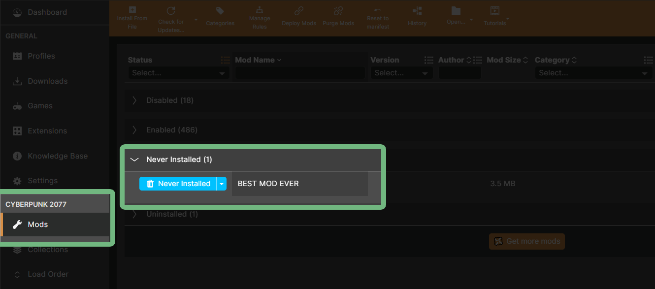 2. Navigate to "Never Installed" in Vortex (on the "Mods" tab). You should see the mod you just downloaded here.
