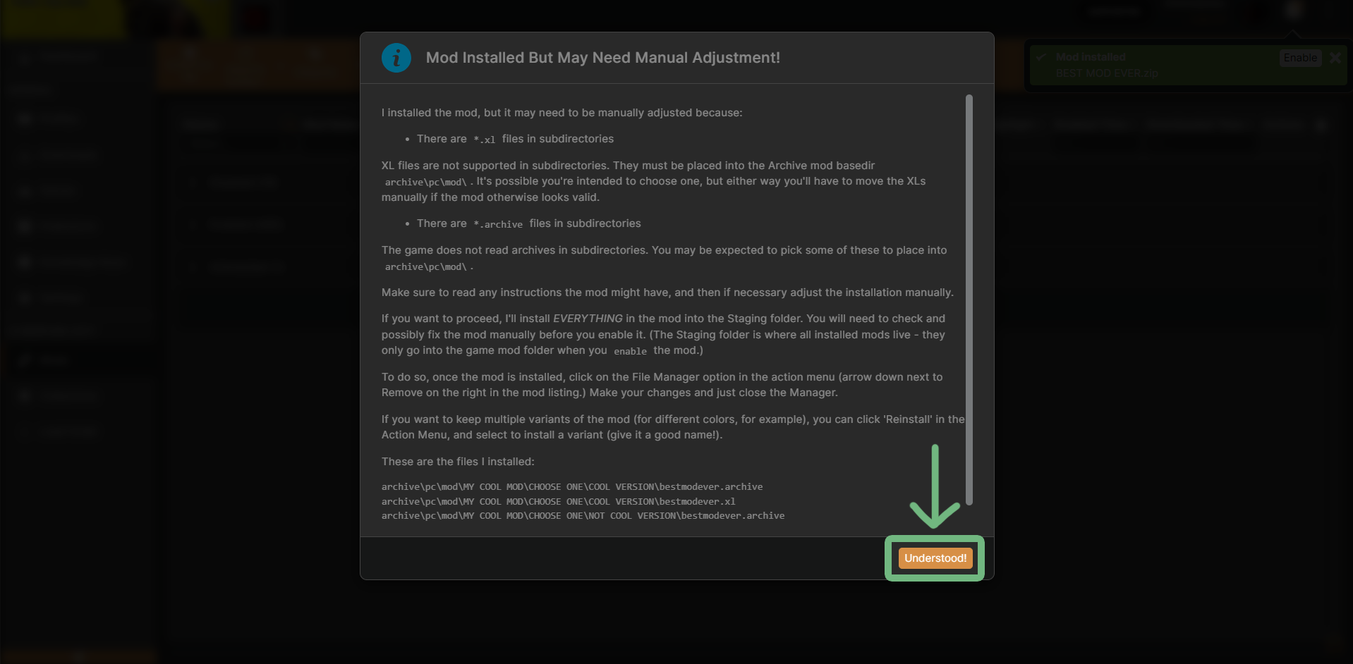 6. You should then get another pop-up that says "Mod installed but may need manual adjustment!". Click "Understood!"
