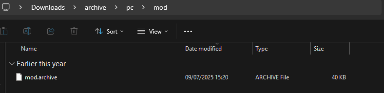3. Now we are left with the `.archive` file going into `Cyberpunk 2077/archive/pc/mod/` \