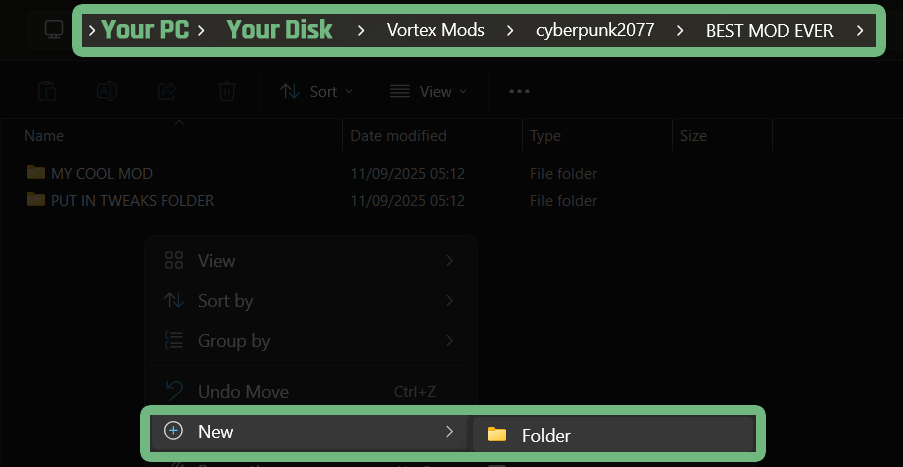 To see how to create new folders from scratch, for mods that have no folder structure or are only partially correct, see [Example #2](#example-2-creating-your-own-folders) (further down).