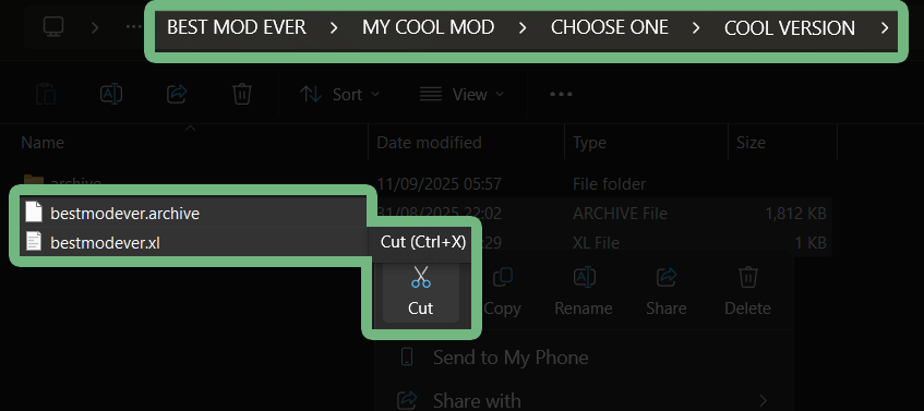 The file structure is different for REDmods and non-REDmods (often referred to as "`legacy`" mods). Mod authors usually tell you which type their mod is. To lean what the difference is, [read here](#whats-the-difference).
