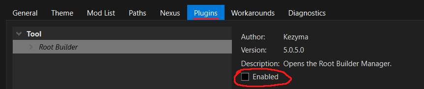 3. Search for **Root Builder** and make sure the **"Enabled"** checkbox is **not checked.** If Root Builder doesn't show up, that means you didn't have it installed in the first place. That's okay! You don't need to do anything more.