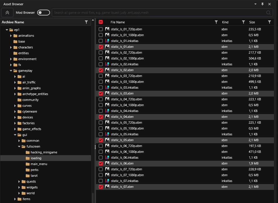 <figure><img src="https://1427525421-files.gitbook.io/~/files/v0/b/gitbook-x-prod.appspot.com/o/spaces%2F4gzcGtLrr90pVjAWVdTc%2Fuploads%2Fgit-blob-126c03cd88408cd653de2bd65bbef99baf29765c%2Fimage.png?alt=media" alt=""><figcaption><p>Phantom Liberty Static Loading Screens Folder</p></figcaption></figure>