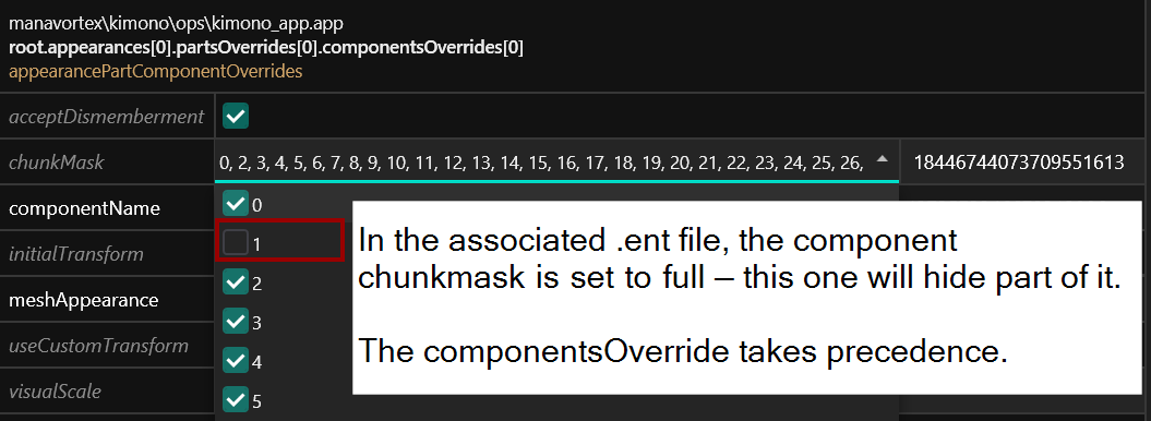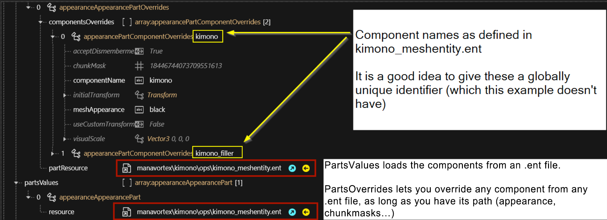 <figure><img src="https://1427525421-files.gitbook.io/~/files/v0/b/gitbook-x-prod.appspot.com/o/spaces%2F4gzcGtLrr90pVjAWVdTc%2Fuploads%2Fgit-blob-493f9bdb143bda8fede56e69918b1bc83e3fa004%2Fparts_values_parts_overrides.png?alt=media" alt=""><figcaption><p>Overwrite the component "<code>kimono</code>" and "<code>kimono_filler</code>", which are defined in the file "<code>kimono_meshentity.ent</code>"<br>This is the reason why Cyberpunk has all the player components stored in .ent files!</p></figcaption></figure>