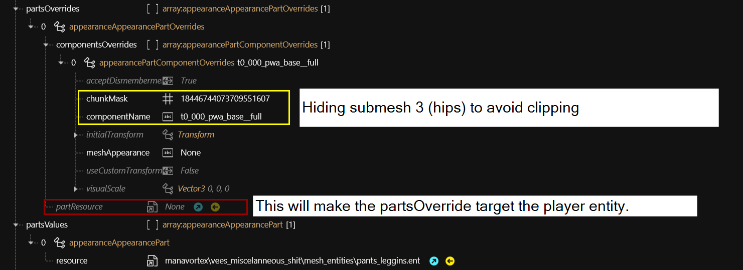 <figure><img src="https://1427525421-files.gitbook.io/~/files/v0/b/gitbook-x-prod.appspot.com/o/spaces%2F4gzcGtLrr90pVjAWVdTc%2Fuploads%2Fgit-blob-793f2b0e39f340dcffe99a92ef1b0078b0e5576b%2FpartsOverrides3.png?alt=media" alt=""><figcaption><p>This is hiding a submesh of the default body, which isn't part of the referenced <code>pants_leggins.ent.</code><br>This is only possible because of ArchiveXL!</p></figcaption></figure>