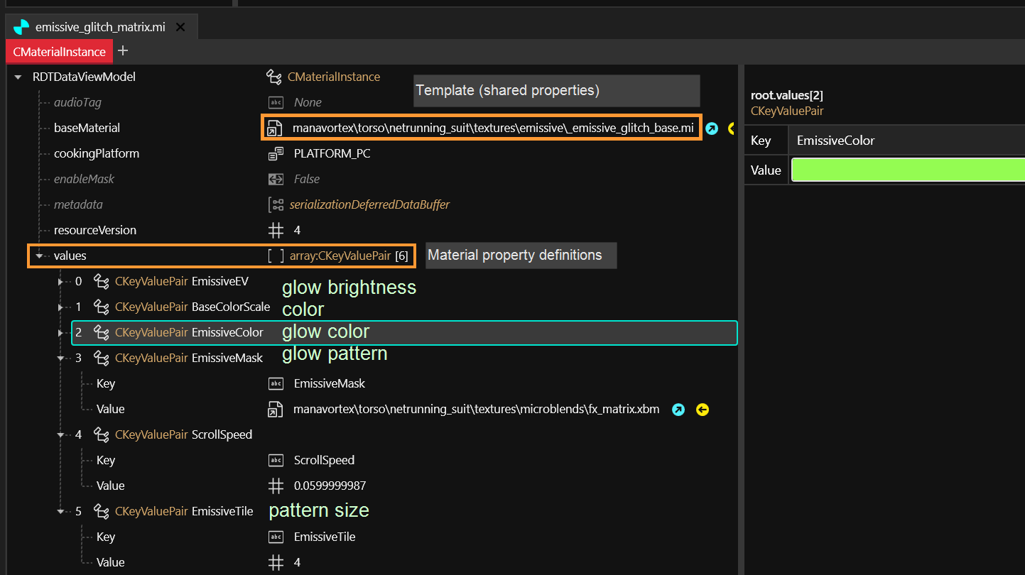 Since ArchiveXL's [Dynamic Appearances](#user-content-fn-1)[^1] feature is **that** cool, you can switch the emissive material simply by changing the property in the .yaml file.