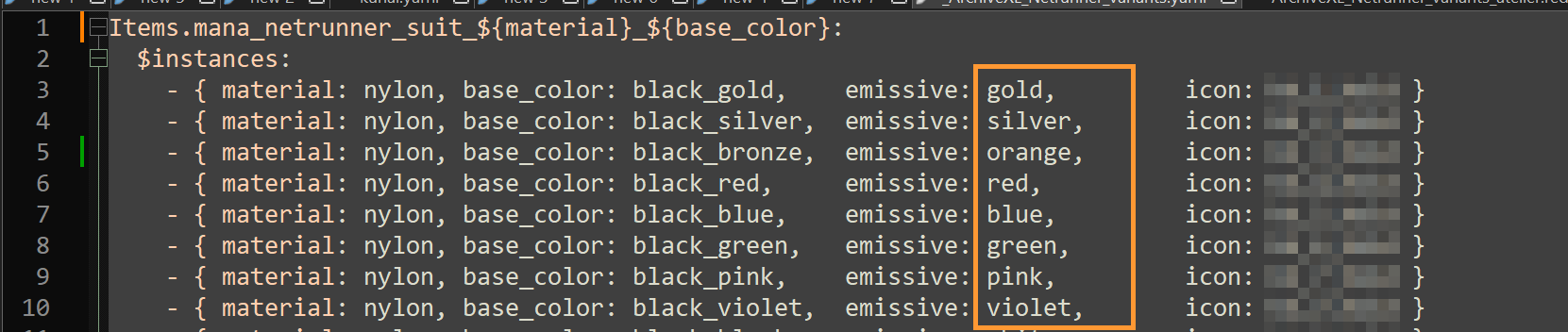 Each file will be named `emissive_VARIANT`, (`VARIANT` being the colour as listed in the table above). E.g., the file for the regular green emissive will be called `emissive_green.mi`