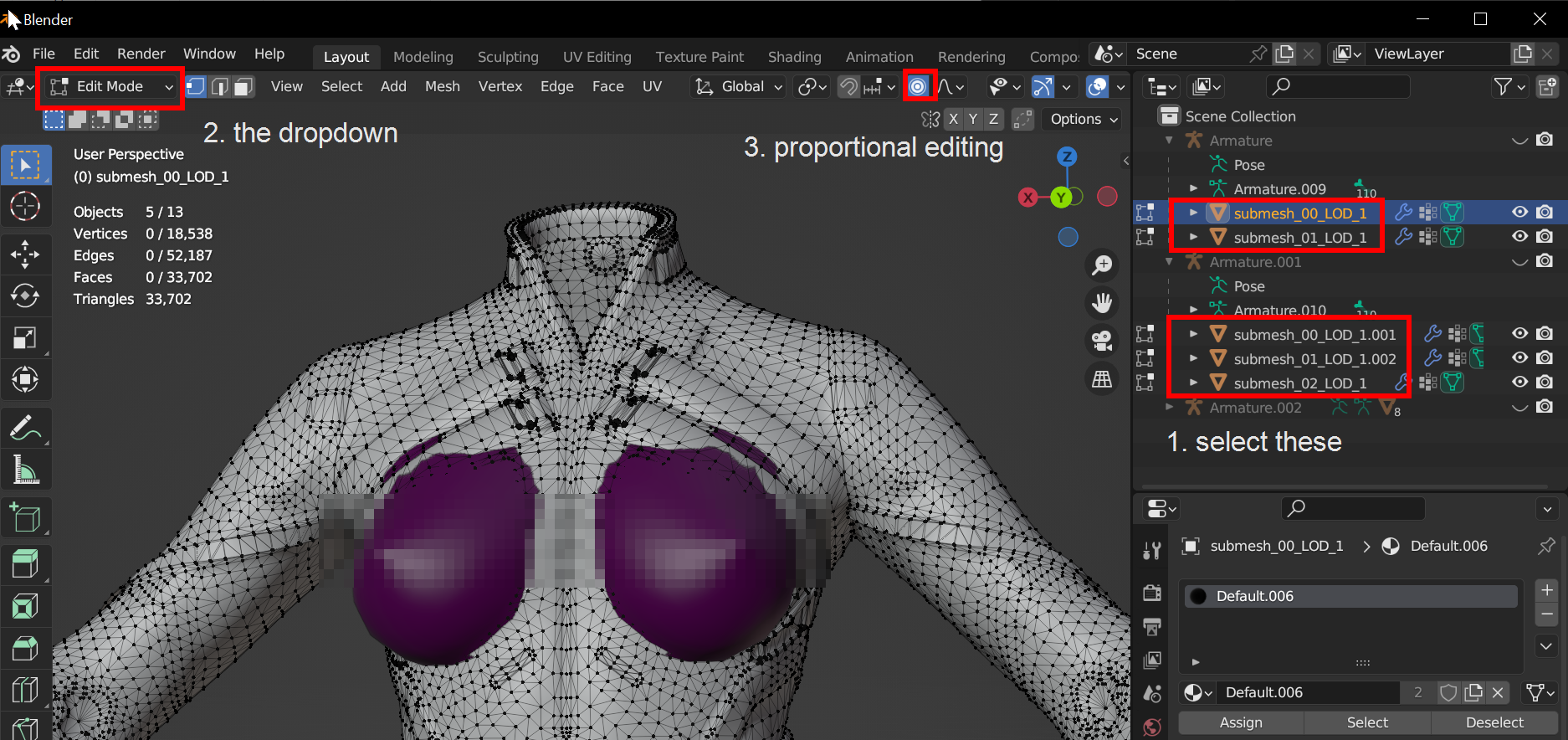 We will use the Proportional Editing mode here, which leaves garment supports intact and prevents the risk of [string cheese](https://wiki.redmodding.org/cyberpunk-2077-modding/for-mod-creators-theory/3d-modelling/troubleshooting-your-mesh-edits#my-mesh-is-string-cheese-exploding-vertices-a-puddle-on-the-floor). If you don't vibe with that, you can read up [here](https://wiki.redmodding.org/cyberpunk-2077-modding/for-mod-creators-theory/3d-modelling/mesh-sculpting-techniques#sculpting) on other approaches for refitting, or refer to the [community guides](https://wiki.redmodding.org/cyberpunk-2077-modding/modding-guides/community-guides) section.