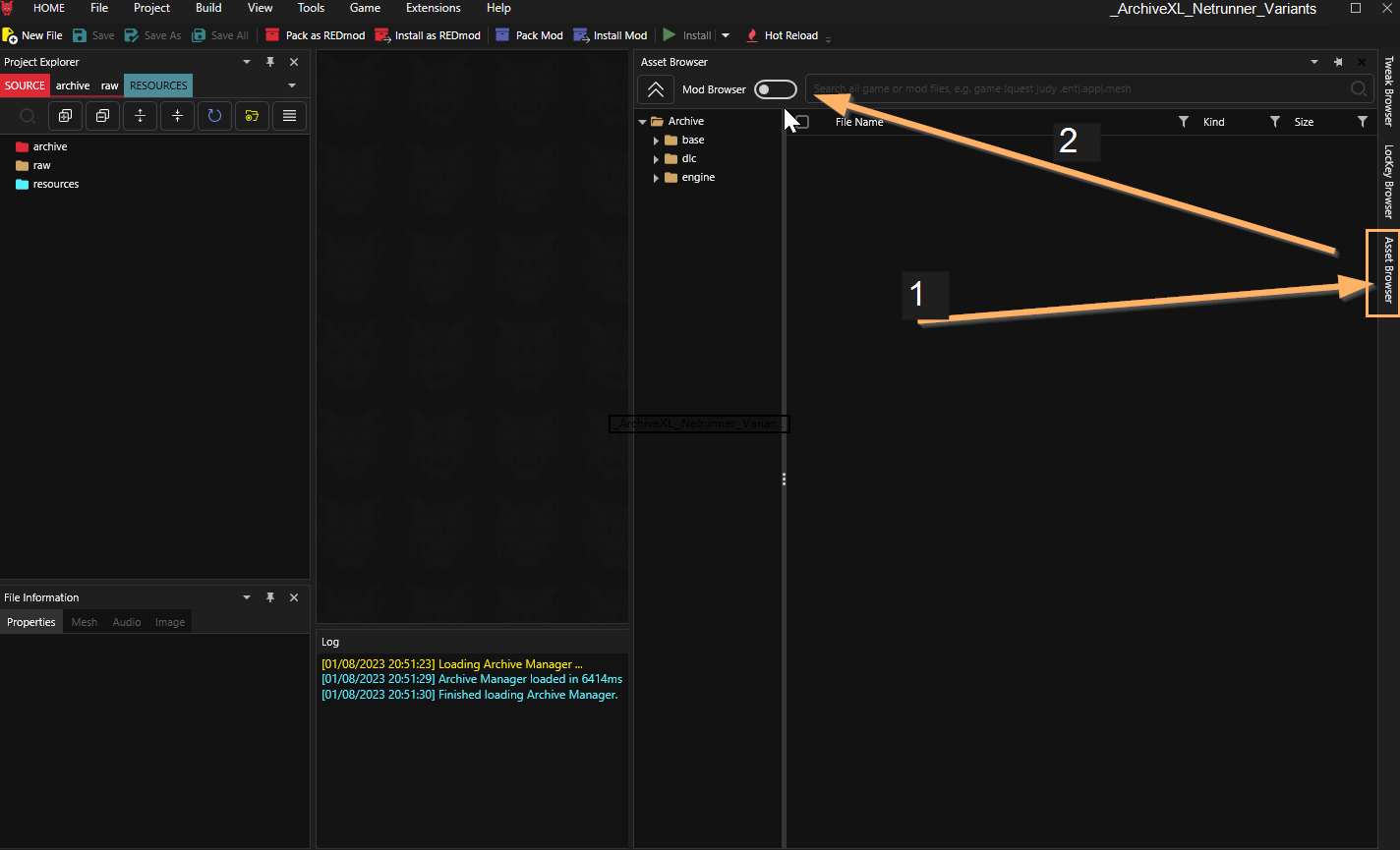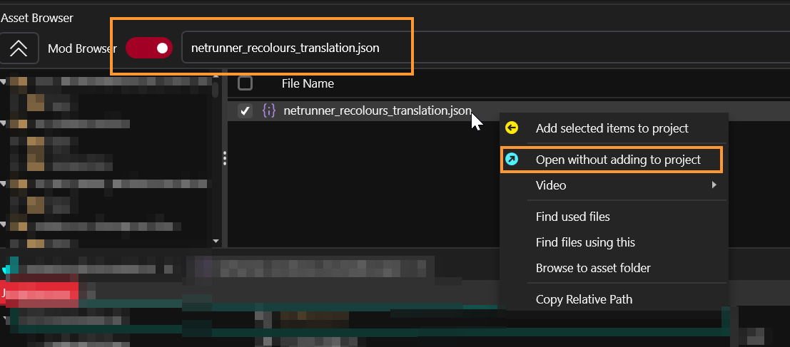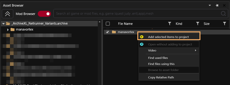 1. In Wolvenkit, open the Asset Browser (pinned at the right-hand side by default), and toggle the switch to "Mod Browser".