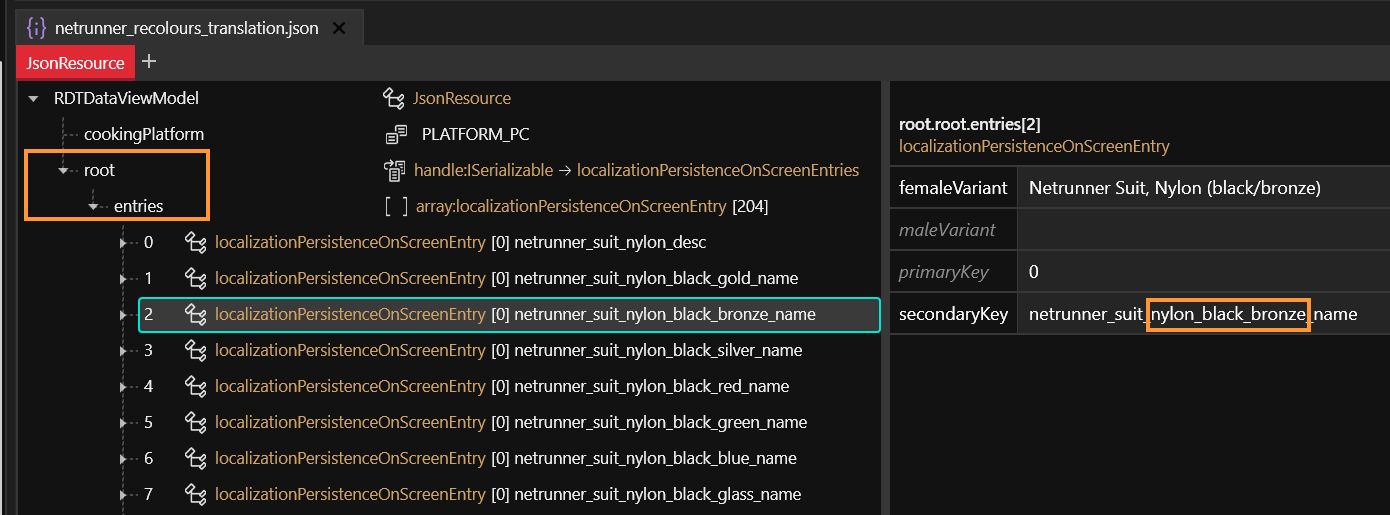 Expand the `root` node and then the `entries` node. By selecting a node, you can see the translation text. The field for `secondaryKey` contains the colour variant, which corresponds to the mlsetup file name: