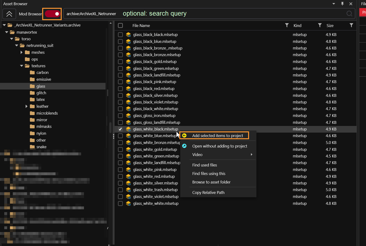 4. Once you have found the correct items (for [recolour](#selected-files-recolour) or [refit](#selected-files-refit)), this is how you add them to the project: