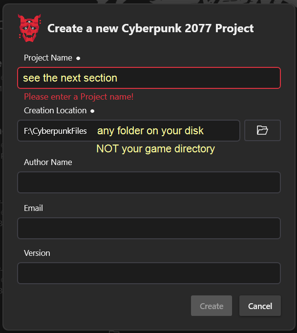 <figure><img src="https://1427525421-files.gitbook.io/~/files/v0/b/gitbook-x-prod.appspot.com/o/spaces%2F4gzcGtLrr90pVjAWVdTc%2Fuploads%2Fgit-blob-dd238b30cba7f1938fb7bdea776e9e4f9cac4392%2Fwolvenkit_create_project.png?alt=media" alt=""><figcaption></figcaption></figure>
