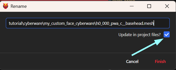 2. Select the `.mesh` file and use Wolvenkit's rename function (`f2`) to move it. Make sure to have the "Update in project files" box ticked.