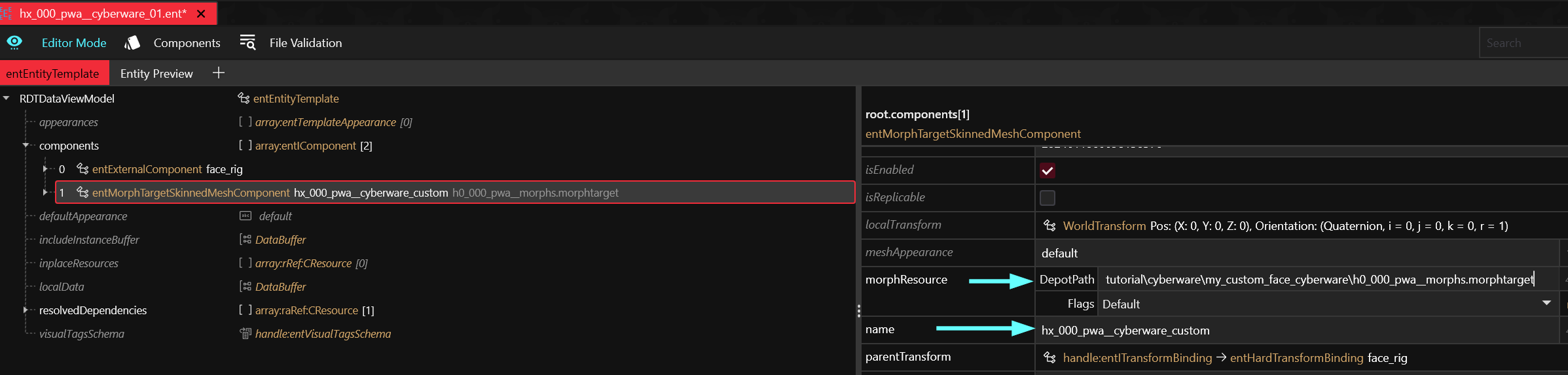 The `.morphtarget` contains the 3d data (the **shape** of the cyberware). It will deform with the face sliders from the character creator.