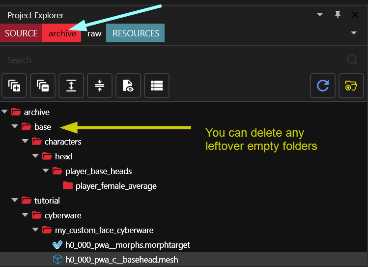 So far, we have a .mesh and a .morphtarget in Wolvenkit. If we packed the mod now, nothing would happen, because the game doesn't know what to do with those files.