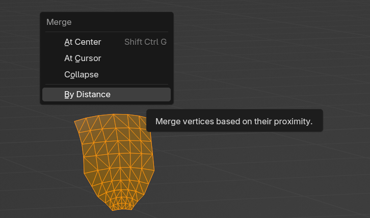 4. To prepare for UV unwrapping, we will now merge by distance (Hotkey: `m`):