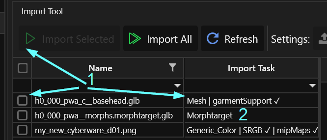 6. On the Import Tool in the bottom left, import **first** the glb that goes into the `.mesh` file:
