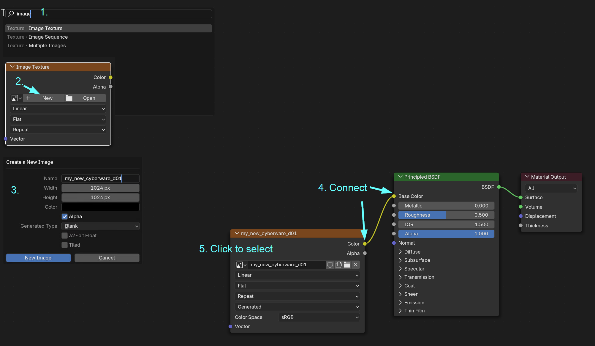 1. Add a new image texture (hotkey: `Shift+A`, type `image`, press enter)