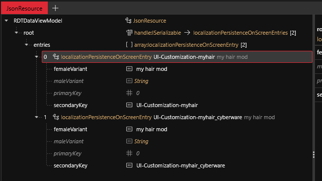 In the end the items should be named `UI-Customization-myhair` and `UI-Customization-myhair_cyberware`,and your json file will look like this. Save the file but don't close it yet.