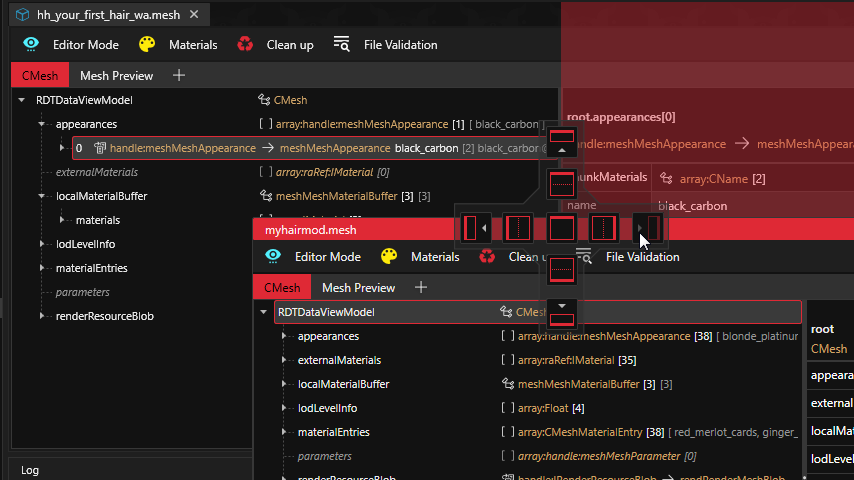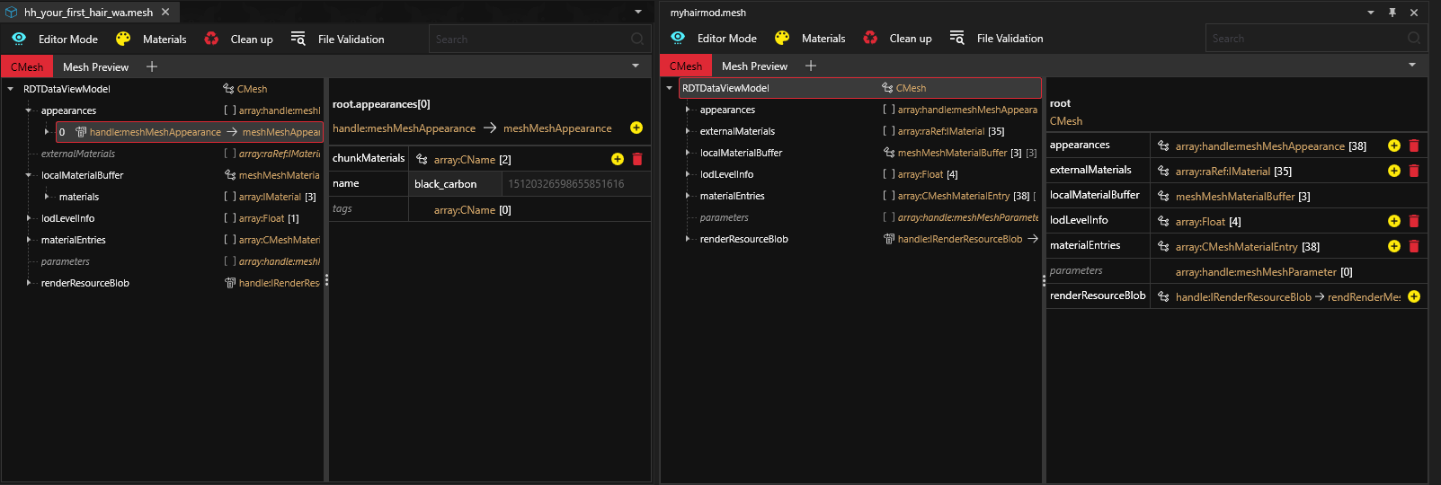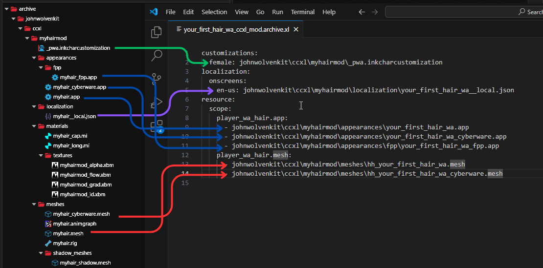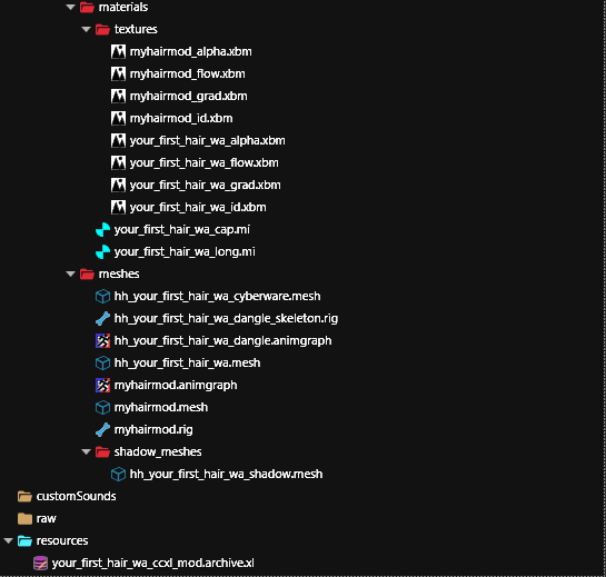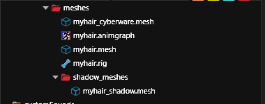 2. Open `your_first_hair_wa_cyberware.app` and replicate the same steps above with the only difference is to copy relative path of the your `.mesh` file that ends with `_cyberware` instead of the normal .mesh file in both `hh_your_first_hair_wa_cyberware` item and the `resolvedDependencies`property. Save and close the file.