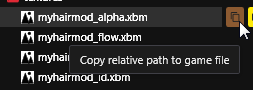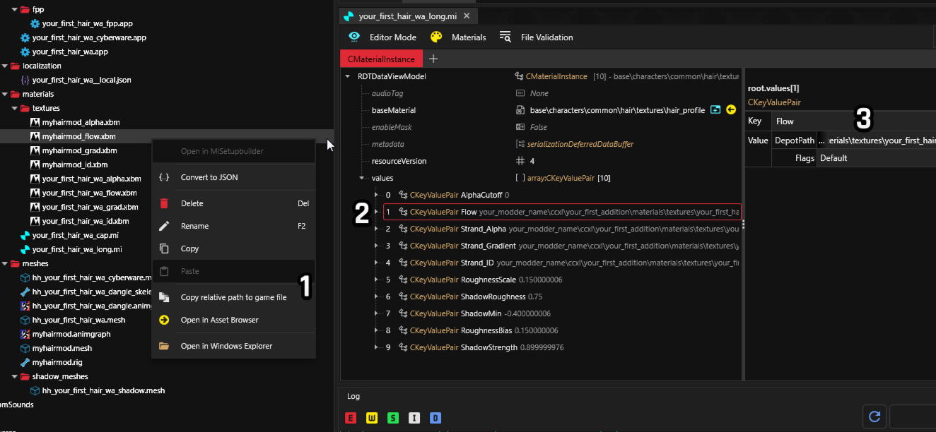 2. Edit the `CKeyValuePair` values of Flow, Strand\_Alpha, Strand\_Graident, and Strand\_ID. This can be done by first right clicking on the fitting name (for flow you would select the file that ends with \_flow), click copy relative path to game file (**1**), then click on the fitting `CKeyValuePair` value name then paste the path to the DepotPath of the `CKeyValuePair`.
