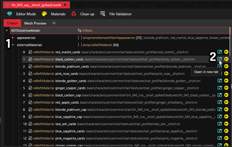 1. Open your mesh and expand the `externalMaterials` item(1), then open one of the mi files that are not cap (2).