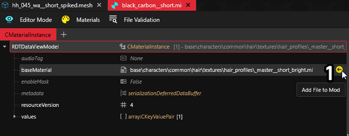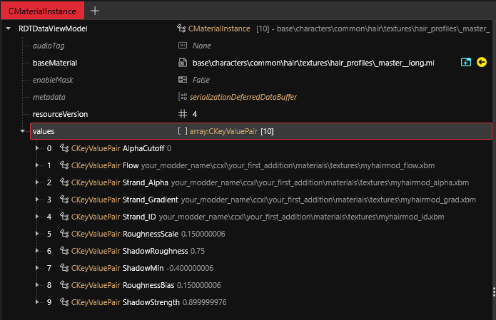 6. Click on the second item named @long (or the name you've changed), in baseMaterial's DepotPath paste the relative path of the material instance that has the same name (so `myhair_long.mi` to the `@long`'s `DepotPath)` and make sure that the Flags are set to soft, do the same process for the `@cap` item.