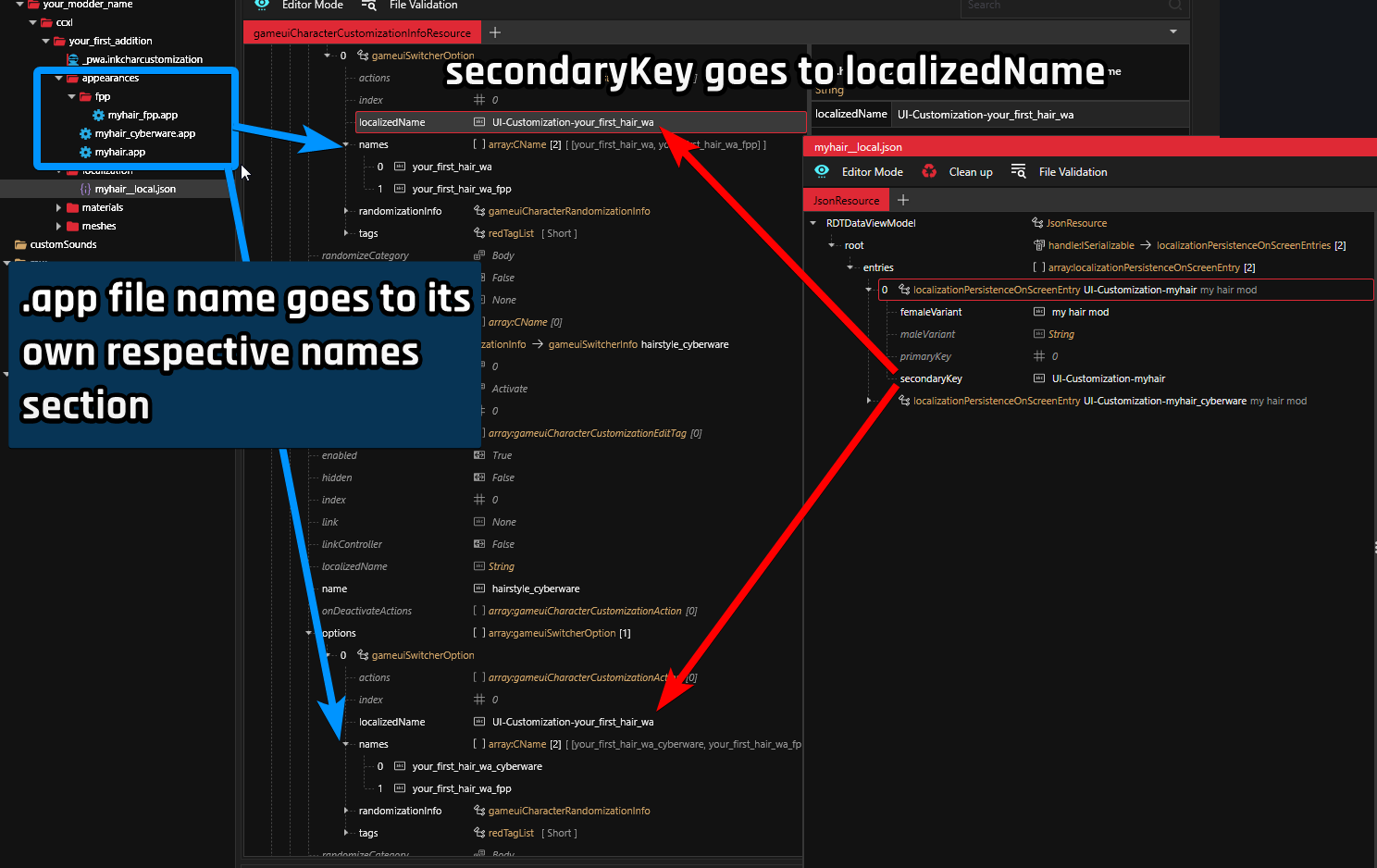 1. Go to the `.json` file and copy the first item's`secondaryKey` property value and paste it in the `localizedName` field. So the localizedName field now has the value`UI-Customization-myhair` This tells the hair slot file that we'll use the name set in the .json file as its display name in-game.