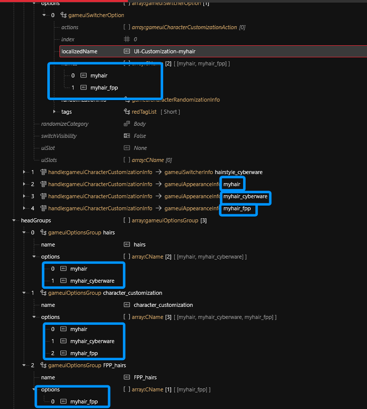 3. Do the same steps for the second item which is named `hairstyle_cyberware`, with the only difference being to rename `your_first_hair_wa_cyberware` to `myhair_cyberware` and the `names` values to `myhair_cyberware` and `myhair_fpp`.