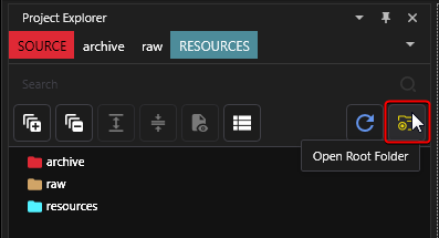 1\. Open the root folder of your WolvenKit project, this can be done by clicking on the yellow folder icon called "Open Root Folder" to open the project's folder in Explorer.