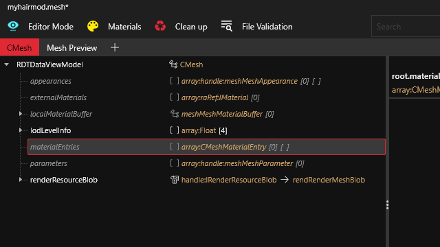2. In your mesh, right click on `appearances` and click on "Reset Object", do the same step for `externalMaterials`, `localMaterialBuffer`, and `materialEntries`. After doing this you should see a number zero or a "\[0]" next to the aforementioned items. This step removes all reference of materials that the mesh used before.