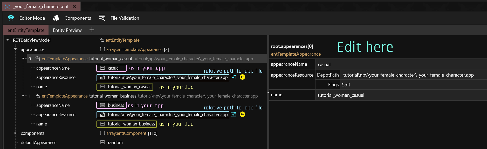 This is where all of your NPC's appearances are defined (`appearanceDefinition`, linked to the root entity via `name`). The appearanceDefinition's components **define** your NPV's properties, such as