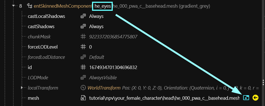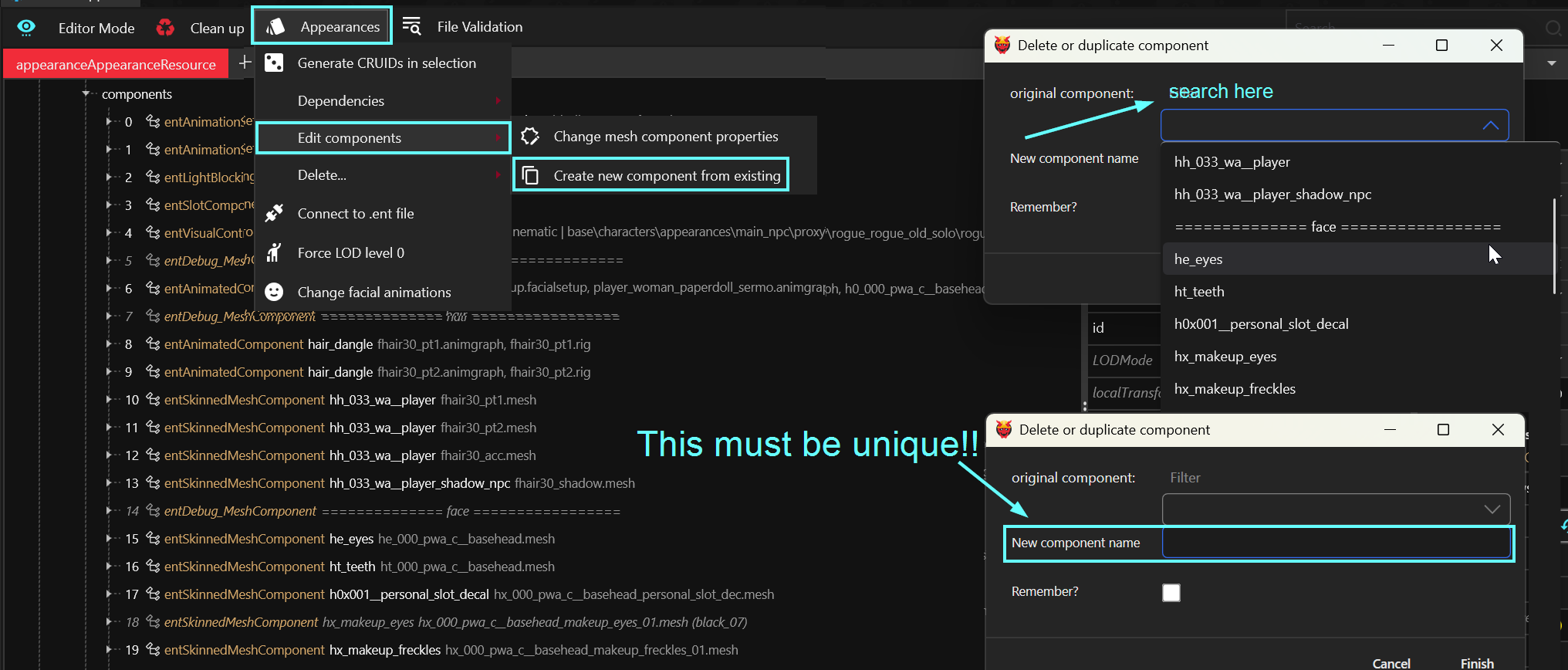 7. If you need to change more about your component, use the [Editor Toolbar #Search Bar](https://app.gitbook.com/s/-MP_ozZVx2gRZUPXkd4r/wolvenkit-app/editor/file-editor/editor-toolbar#search-bar "mention") to display only your new component across all appearances.