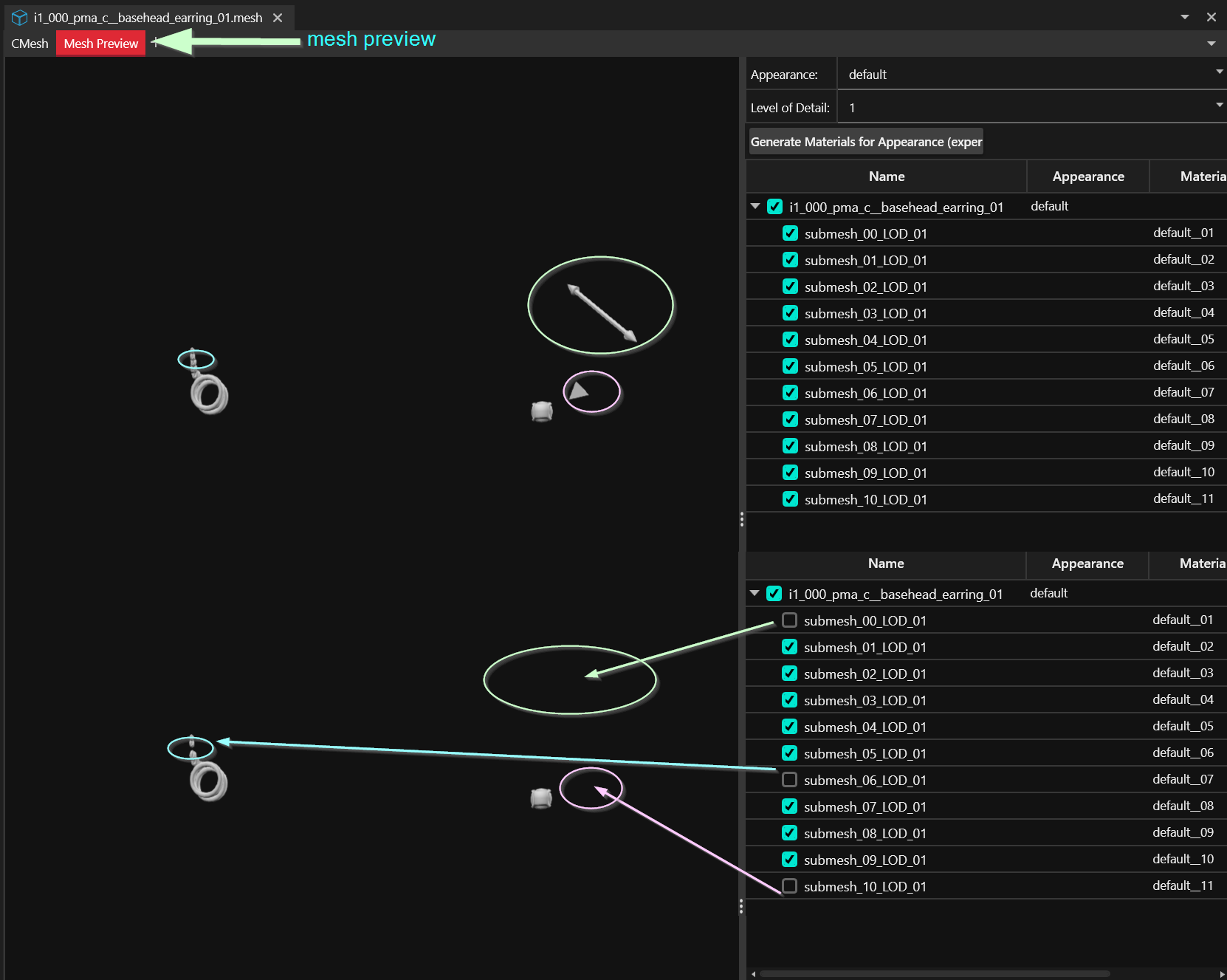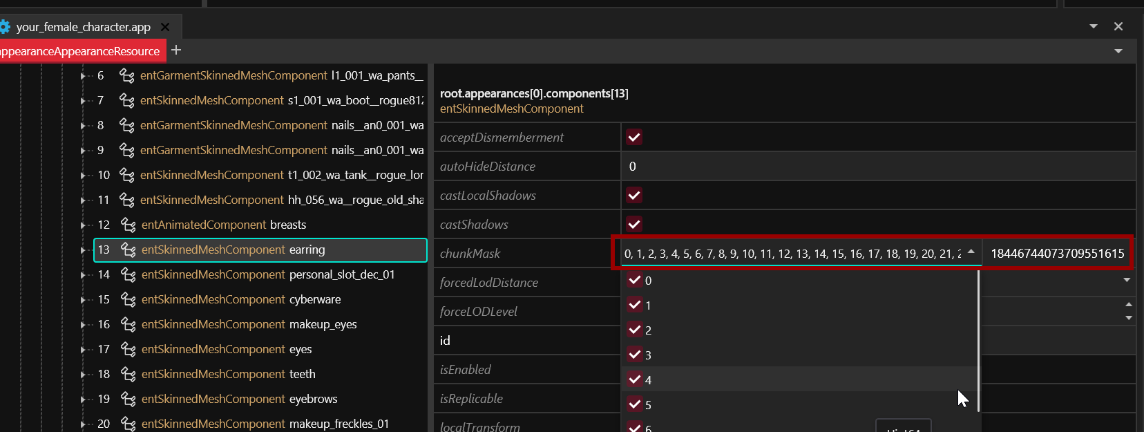 You can see that inside the .mesh file (which you can see in the component's `depotPath`). Open it in Wolvenkit, then switch to the [Mesh Preview](https://app.gitbook.com/s/-MP_ozZVx2gRZUPXkd4r/wolvenkit-app/editor/file-editor/preview#mesh-preview) tab and toggle the checkboxes on the right; those directly correspond to the boxes you need to uncheck in the `.app` file: