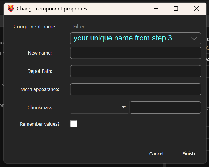 6. The other properties should be self-explanatory — this will edit the component's depot path, mesh appearance, and chunk mask.