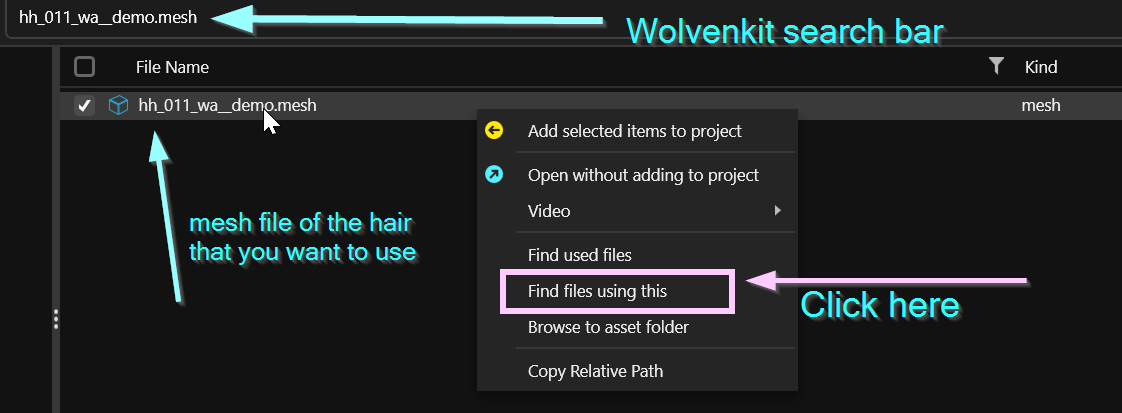 4. Once you have found the correct mesh file, right-click it and select "Find Files Using This":